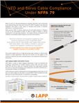 “Electrical conductors and equipment supplied by power conversion equipment as part of adjustable speed drive systems shall be listed flexible motor supply cable marked RHH, RHW, RHW-2, XHH, XHHW, or XHHW-2 or selected based on the equipment manufacturers instructions.” –Circuits Supplied From Power Conversion Equipment , Chapter 4, Section 4.4.2.8, NFPA 79 2018 While previous NFPA 79 editions reference wire and cable primarily in Chapters 12 and 13, the 2018 Edition of NFPA 79 refers to cable in Chapter 4, General Requirements and Operating Conditions . This chapter directly corresponds to the conditions surrounding variable frequency and servo drive systems. This revision supports the use of high performing cable insulation to reduce safety concerns in these applications. Note that the revision not only applies to the conductors listed but also other materials based on the equipment manufacturers’ instructions. LAPP CABLES COMPLY WITH NFPA 79 2018 LAPP offers a variety of cables designed specifically to meet the technical and compliance requirements of variable frequency drives (VFD) and servo drives. These VFD and servo cables are composed entirely from high-quality materials that meet or exceed the standards set by leading drive and motor manufacturers— including Allen-Bradley ® and SIEMENS ® . LAPP’s extensive research, development and testing programs ensure that our full line of UL-listed cables not only meet or exceed NFPA 79 2018 standards but also offer best-of-class EMI protection, oil resistance and flexibility. NFPA 79 is the U.S. Electrical Standard for Industrial Machinery and is referenced by the National Electrical Code under Article 670. NFPA 79 applies to the electrical equipment used within a wide variety of machines—and groups of machines operating in a coordinated manner.